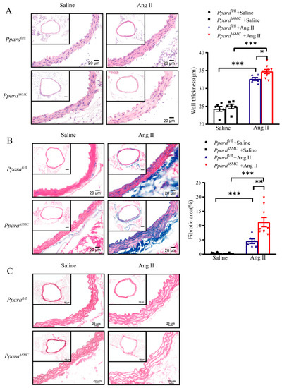 Vascular remodeling is the fundamental pathophysiology of hypertension [28]. To identify whether VSMC PPARα regulates vascular remodeling, a morphological analysis was performed. H&E staining demonstrated that the aortic wall thickness was significantly increased in PparaΔSMC mice compared with Pparafl/fl mice upon an Ang II treatment (Figure 3A). Masson’s trichrome staining revealed that a PPARα deficiency in VSMCs greatly aggravated the collagen deposition in the media and the adventitia of the aortic tissues (Figure 3B). Weigert’s elastin staining showed no difference in the elastic fiber structure between the four groups (Figure 3C). These data suggested that a PPARα deficiency in VSMCs aggravated an Ang II-induced vascular remodeling.
