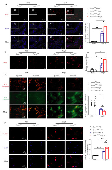 Mitochondrial superoxide, an important source of reactive oxygen species (ROS) in VSMCs, was measured by staining with MitoSOX Red (Invitrogen, M36008, Waltham, MA, USA). The VSMCs (1 × 105) from PparaΔSMC and Pparafl/fl mice upon the Ang II treatment (1 μmol/L) for 24 h were loaded with MitoSOX Red (5 μM) for 10 min at 37 °C and then washed. The images were acquired using an Olympus laser scanning microscope (U-LH100-3, Olympus Corporation, Tokyo, Japan).