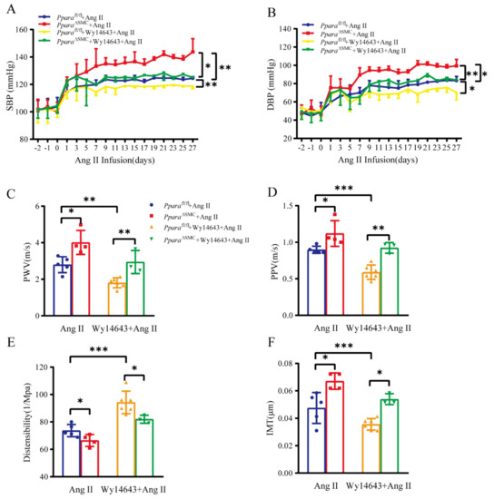 Activation of PPARα by Wy14643 attenuated Ang II−induced hypertension and vascular stiffness. (A) Systolic blood pressure (SBP) and (B) diastolic blood pressure (DBP) was measured by noninvasive tail–cuff method before and after Wy14643 treatment in Ang II infusion mice (490 ng/kg/day). (C) Pulse wave velocity (PWV), (D) pulse pressure variation (PPV), (E) distensibility, and (F) intima-media thickness (IMT) were measured by vascular ultrasound (n = 3–6, two-way ANOVA). Data are means ± SEM. * p < 0.05, ** p < 0.01, *** p < 0.01 between groups.