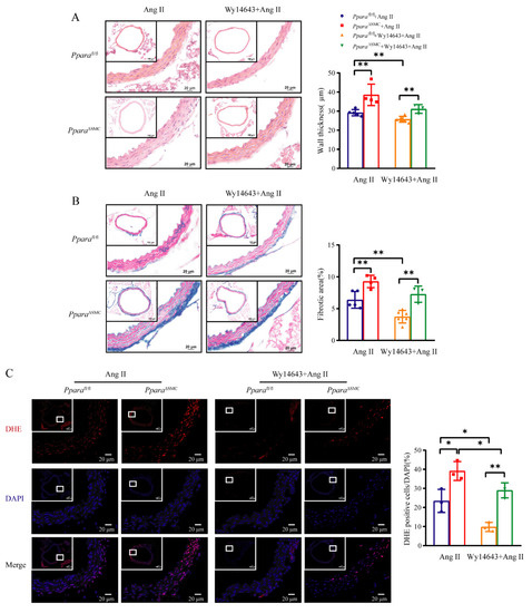 3.6. Wy14643 Improved Ang II-Induced Vascular Remodeling and ROS Production in a VSMC PPARα-Dependent Manner