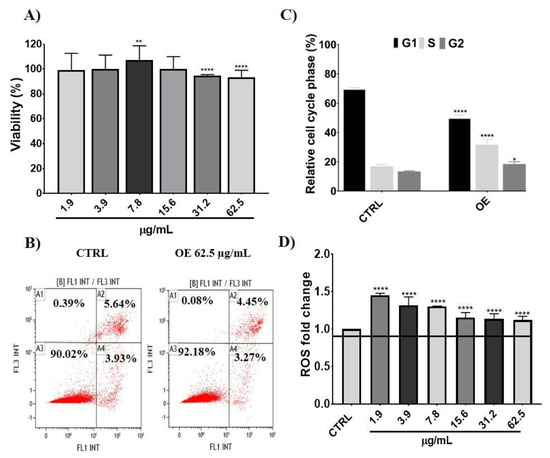 As previously mentioned [34], the dichlorofluorescein test was used to measure the intracellular amount of ROS. In brief, cells were grown in 96-well plates at a density of 104 cells/well and exposed to OE (1.9–62.5 µg/mL) for 24 h. After incubation, 20 µM of 20,70– dichlorofluorescein diacetate (DCFH-DA; D6883; Sigma-Aldrich, St. Louis, MO, USA) was added to the cells for 20 min in PBS at 37 °C. Using a microplate reader (Varioskan Lux, Thermo Fisher, Waltham, MA, USA) and emission and excitation wavelengths of 535 nm and 485 nm, respectively, the fluorescence produced by the oxidation of DCF was measured. A fold change vs. control was used to express the ROS levels. Data were collected in triplicate from three separate studies.