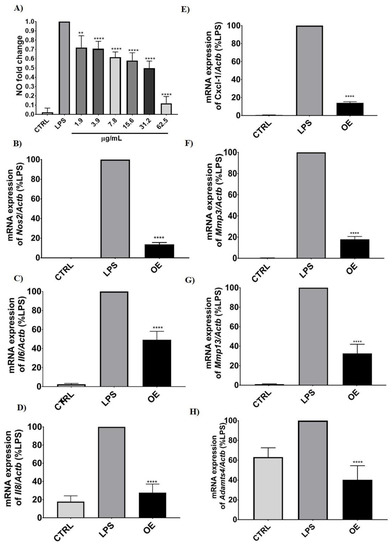 Onion extracts’ effects on LPS-induced NO generation. Results are expressed as a fold change vs. LPS (A) and expression of Nos2 (B), Il6 (C), Il8 (D), Cxcl1 (E), Mmp3 (F), Mmp13 (G), and Adamtl4 (H) by RT-qPCR in ATDC-5 cell line. Cells were pretreated for 4 h with 62.5 g/mL of onion extract before being induced with LPS (250 ng/mL) or not (control cells) for 24 h. The level of the target mRNA was normalized to the level of Actb and expressed as a percentage of LPS, which was arbitrarily set to 100%. Data are expressed as mean ± SD of at least 3 independent experiments performed in triplicate and showed statistically significant differences between the control samples and the treated ones (* p ≤ 0.05; ** p ≤ 0.01; *** p ≤0.001; **** p ≤ 0.0001 vs. control). CTRL = control sample; OE = onion extract.