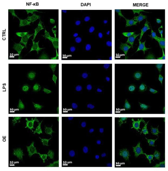 Cells were grown at a density of 5.7 × 104 cells/cm2 onto 24-well plates on glass coverslips. After treatment with OE and/or stimulation with LPS, cells were fixed for 15 min with freshly cold formaldehyde (3.7%). Then, cells were washed with PBS and incubated with blocking buffer (which contains 5% normal goat serum (Sigma-Aldrich, St. Louis, MO, USA) and 0.3% Triton X-100 (Sigma-Aldrich, St. Louis, MO, USA)) for 1 h at room temperature. Next, primary anti-NF-κB/p65 rabbit monoclonal antibody (1:100; Abcam, Cambridge, UK) was added to each well and incubated at 4 °C overnight. After this, cells were incubated with secondary Alexa Fluor® 488 goat anti-rabbit IgG (H + L) polyclonal antibody (1:1000; Molecular Probes, Eugene, OR, USA) for 2 h and stained with 2 µg/mL of DAPI (Molecular Probes, Eugene, OR, USA) for 10 min at room temperature [35]. Mowiol mounting medium (Thermo Fisher, Waltham, MA, USA) was used to attach coverslips to glass slides. Confocal microscopy (Leica TCS SP2 Laser Scanning Confocal Microscope, München, Germany) was used to visualize the samples. Three separate experiments were conducted.