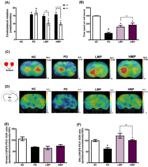 In the striatum, the groups lesioned with 6-OHDA showed lower [18F] FE-PE21 SUR ratios compared to the healthy NC group (Figure 2E). Although not statistically significant, the striatal uptake ratio of the HMP group was slightly higher than that of the untreated PD group. However, the untreated PD group exhibited a significantly lower [18F] FE-PE21 SUR ratio in the SNc than the healthy NC group (Figure 2F). In contrast to the untreated PD group, the groups treated with LMP and HMP exhibited significantly higher SURs in the SNc, with the LMP group showing a slightly higher SUR than the HMP group. A higher uptake ratio indicates higher DAT binding activity, suggesting a possible increase in the number of active dopaminergic neurons. Taken together with the motor function results, the PET results indicate that supplementation with the MP extract, at either a low or high dose, preserved active dopaminergic neurons in the motor control basal ganglia circuit and may have improved motor function in this PD-like rat model.