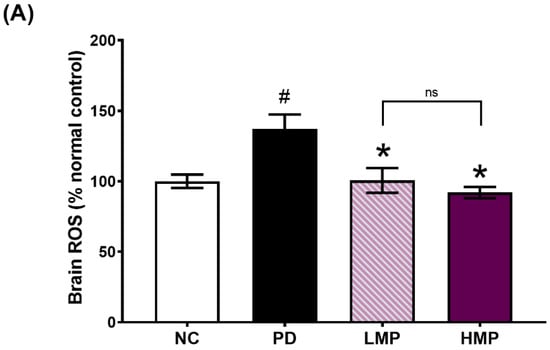 We analyzed the levels of ROS and the expression of Sod1, Sod2, Cat, Gpx, and Nrf2 in the brain (Figure 3A,B). The levels of ROS in the brain were significantly higher in the untreated PD group than the healthy NC group. In contrast, the groups supplemented with LMP and HMP had significantly lower levels of ROS level in the brain. Moreover, the reductions in ROS in the supplemented groups were accompanied by increased expression of Sod1, Sod2, Cat, and Gpx in the brain.