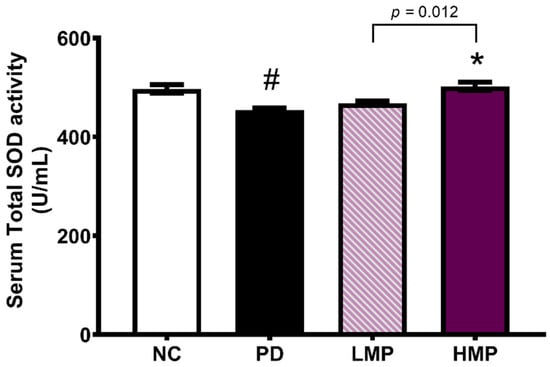 To investigate whether a link exists between the observed improvement in motor function and the antioxidant capacity of skeletal muscle, we next analyzed the mRNA expression of endogenous antioxidants (Sod1, Sod2, Cat, and Gpx) and an antioxidant-related transcription factor (Nrf2) in the soleus muscle (Figure 3C). After the 6-OHDA injection, the untreated PD group exhibited significantly lower expression of Sod1, Sod2, Cat, and Nrf2 in the muscle compared to the healthy NC group. However, supplementation of PD rats with MP led to higher expression of these antioxidant-related genes in the muscle, with statistically significant increases in Sod1 and Nrf2. Moreover, the HMP group exhibited a significantly higher serum level of total SOD compared to the PD group (Figure 4), suggesting that high-dose MP might offer more-potent antioxidant activity than low-dose MP.