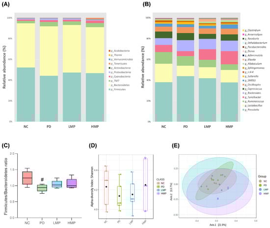 Comparison of the relative bacterial abundances and analysis of bacterial diversity based on 16S sequencing analysis of fecal samples after 8 weeks of supplementation in the rat model of PD. (A) Distribution of the top ten most abundant bacteria at the phylum level across all groups. (B) Distribution of the top twenty most abundant bacteria at the genus level across all groups. (C) Firmicutes to Bacteroidetes ratios of each group. # p < 0.05 for the Parkinson’s disease (PD) group vs. the normal control (NC) group. (D) Analysis of alpha diversity based on the Shannon index. (E) Analysis of beta-diversity based on principal coordinates analysis (PCoA) of the Bray–Curtis index. The ellipses illustrate 95% confidence intervals for the normal control (NC) versus Parkinson’s disease (PD) versus low-dose mangosteen pericarp (LMP) versus high-dose mangosteen pericarp (HMP).