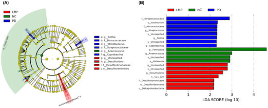 Linear discriminant analysis (LDA) effect size (LEfSe) of fecal microbiota enrichment in the normal control (NC), Parkinson’s disease (PD), low-dose mangosteen pericarp (LMP), and high-dose mangosteen pericarp (HMP) groups after 8 weeks of supplementation. (A) The circles of the phylogenetic tree cladogram demonstrate the classification of the fecal microbiota from the phylum to genus level. The diameter of the circles illustrates relative abundance. The typescripts A to J in A represent 10 different taxa. (B) LDA scores for differentially abundant taxa between the NC, PD, LMP, and HMP groups. Taxa with an LDA score >2 (log 10) were included in the LEfSe analysis. There was no distinct taxonomic enrichment between the HMP group and other groups; thus, the HMP group is not shown in the phylogenetic tree cladogram. C, class; F, family; G, genus; O, order; P, phylum.