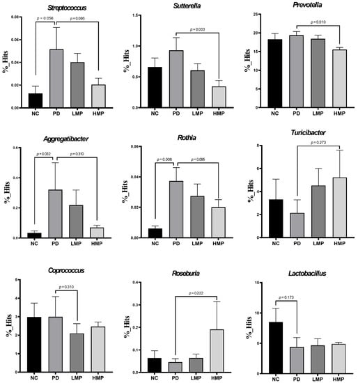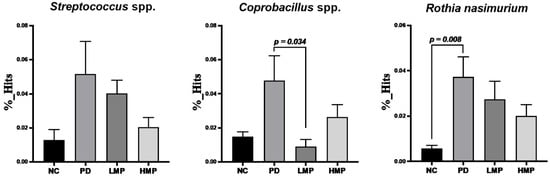 Following the LEfSe analysis, we further analyzed changes in specific genera and species, as shown in Figure 8 and Figure 9, respectively. Specifically, trends towards increases in Streptococcus, Sutterella, Prevotella, Aggregatibacter, and Rothia were observed in the untreated PD group compared to the NC group. Concomitantly, slight reductions in Turicibacter, Roseburia, and Lactobacillus were also found in the untreated PD group. In contrast, the HMP group exhibited significant decreases in Prevotella and Sutterella. Although not significant, the relative abundances of Streptococcus, Sutterella, Aggregatibacter, and Rothia decreased while the relative abundances of Turicibacter, Roseburia, and Lactobacillus were relatively increased in the HMP group compared the untreated PD group. The microbiota-reshaping effects of HMP were also noted at the species level, with relatively lower abundance of Streptococcus spp., Coprobacillus spp., and Rothia nasimurium observed in the HMP group.