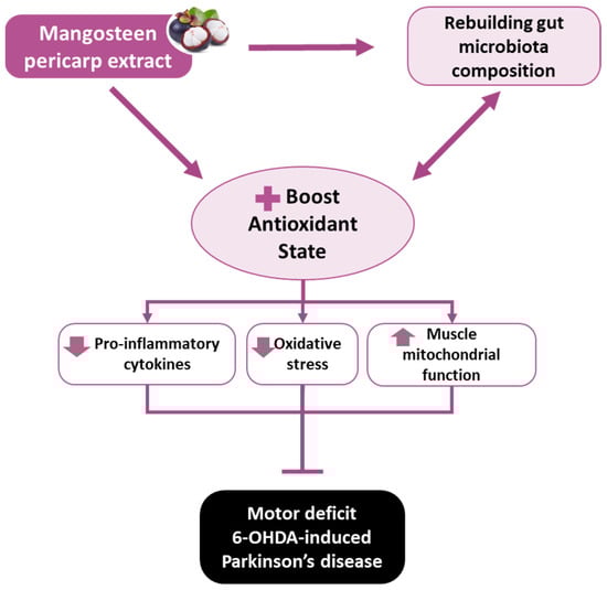 Moreover, MP extract may also indirectly improve the cellular antioxidant defense system through fecal microbiota alterations (Figure 6, Figure 7, Figure 8 and Figure 9). Some of the alterations observed in the abundance of fecal bacteria positively correlated with enhanced antioxidant capacity in the brain and muscles. The correlation between the fecal microbiota and antioxidant capacities in the brain and muscles indicate a potentially important role for the gut microbiota profile in the progression of PD. Additionally, the abundance of several bacterial genera that positively correlated with the levels of pro-inflammatory cytokines were suppressed by MP. This strongly suggests that the mechanisms of action MP extract might be initiated by reshaping the gut microbiota profile, which in turn regulates antioxidative and inflammatory responses at the systemic level and, as a consequence, MP affected the antioxidant capacity and energy metabolism in the brain and muscles. Ultimately, the MP extract protected active dopaminergic neurons and attenuated motor deficits. The proposed mechanisms of action by which MP extract delayed the motor deficits in 6-OHDA-induced PD are presented in Figure 10.