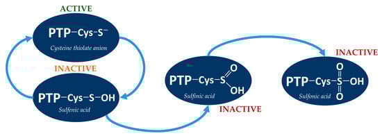 PTPs serve as key mediators of cell signaling and the reactive oxygen species (ROS) level, as reversible oxidation is the main mechanism for control of PTPs’ activity. The catalytic cysteine residue in the active center of protein tyrosine phosphatases is in the form of a thiolate anion, and because of its microenvironment has a low pKa (~5.4), which induces sensitivity to oxidation. The oxidation of catalytic cysteine inhibits the ability of the enzyme to dephosphorylate the substrate, involving the transfer of a phosphate group from the substrate to the catalytic cysteine. Depending on the degree of oxidation, the cysteine residue in the active center may turn into a form of sulfenic (SOH), sulfinic (SO2H) or sulfonic acid (SO3H) Figure 2. Oxidation of cysteine residues to form a sulfenic acid is reversible, because it can be reduced in a cell by glutathione or thioredoxin. Accordingly, the high oxidation potential of the environment can result in the conversion of cysteine to an irreversible form of sulfinic or sulfonic acid []. However, in some cases, sulfiredoxin (S. cerevisiae yeast protein) can reduce sulfinic acid residue of peroxiredoxin Tsa1 in the presence of magnesium ions and ATP []. Peroxiredoxin, like tyrosine phosphatases, contains the redox-active cysteine residue in the active site [].