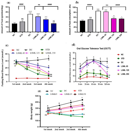 Effect of LSML extract on the changes of (a) food consumption, (b) fluid intake, (c) Fasting Blood Glucose level; (d) oral glucose tolerance test (OGTT) and (e) body weight in STZ-induced diabetic rat model (n = 5). Data are expressed as Mean ± SD. Statistical analysis was performed with one-way analysis of variance (ANOVA), followed by Tukey’s Multiple Comparison Test using GraphPad Prism 8.0 Software. The a–d superscript letters over the lines of the figure indicate the significant differences between and among the treatment groups at p < 0.05. Different letters indicate that the differences are significant while same letters do nonsignificant. Here, * = p < 0.05; ** = p < 0.01; *** = p < 0.001, **** = p < 0.0001 and ns as not significant when compared with normal control group. #### = p < 0.0001 and ns as not significant when compared with diabetic control group.