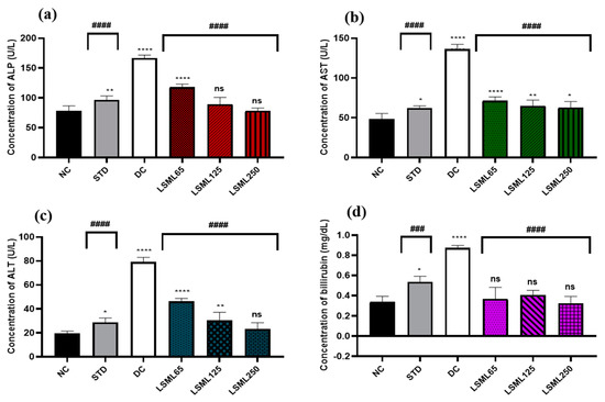 Effect of different doses of LSML extract on the changes of serum (a) ALP, (b) AST, (c) ALT, and (d) TB level assessed against STZ-induced diabetes in Long Evan rats. Results are represented as the mean ± SD, where n = 5. ### = p < 0.001; #### = p < 0.0001 and ns = not significant, when compared with diabetic control group. **** = p < 0.0001, ** = p < 0.01, * = p < 0.05 and ns = not significant, when compared with normal control group.