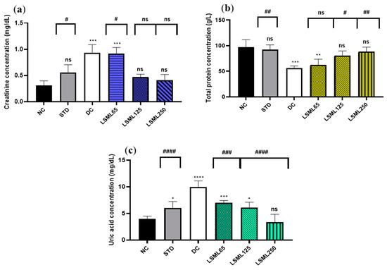 Effect of different doses of LSML on the changes of serum (a) creatinine level; (b) total protein concentration; (c) uric acid concentration assessed against streptozotocin-induced diabetes in Long Evan rats. Results are represented as the mean ± SD, where n = 5. #### = p < 0.0001, ### = p < 0.001, ## = p < 0.01, # = p < 0.05 and ns = not significant when compared with the diabetic control group. **** = p < 0.0001, *** = p < 0.001, ** = p < 0.01, * = p < 0.05, and ns = not significant, when compared with the normal control group.