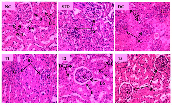 Histopathological interpretation of kidney tissue sections of different groups of the experimental diabetic animals. Light micrographs of hematoxylin and eosin staining of rat kidney (microscopic resolution: 10 × 40). Here, the different groups are denoted by NC—Normal control, STD—Standard, DC—Diabetic control, T1—LSML65, T2—LSML125, and T3—LSML250. The arrow shows that BC—Bowman’s capsule, BS—Bowman’s space, G—Glomerulus, DCT—Distal convoluted tubule, PCT—Proximal convoluted tubule.