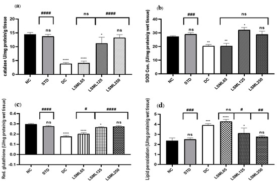 The effect of different doses of LSML extract on the antioxidant activities of (a) catalase (CAT), (b) superoxide dismutase (SOD), (c) reduced glutathione peroxidase (GPX1), (d) lipid peroxidation (LPO) was assessed against streptozotocin-induced diabetes in Long Evan rats. Results are represented as the mean ± SD, where n = 5. # = p < 0/05, ## = p < 0.01, ### = p <0.001, #### = p < 0.0001 and ns = not significant compared to the hepatic control group. **** = p < 0.0001, *** = p < 0.001, ** = p < 0.01, * = p < 0.05 and ns = not significant when compared with the normal control group.
