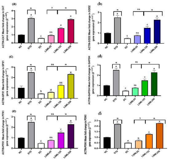 Effect of different doses of LSML extract on (a) CAT (Catalase), (b) SOD2 (Superoxide dismutase 2), (c) GPX1 (Glutathione peroxidase 1), (d) GAPDH (Glyceraldehyde-3-phosphate dehydrogenase), (e) PFK1 (Phosphofructokinase 1), (f) PON1 (Paraoxonase1) mRNA levels in the effect of different doses of LSML extract on liver CAT (Catalase) mRNA expression levels in a diabetic rat model. Total RNAs were isolated from rat hepatocytes. RNA-derived cDNA was used for the qRT-PCR analysis using 45 cycles of real-time PCR program. The relative ratios of mRNA levels were calculated using the 2−ΔΔCT method normalized with β-ACTIN (Beta actin protein) CT value as the internal control and the control as the calibrator. Values are means (n = 3) and values at the same time point with different lower-case letters displayed above the columns of the figure indicating significant difference or not. Here, a = p < 0.0001, b = p < 0.001, c = p < 0.01, d = p < 0.05 when compared with NC; α = p < 0.0001, γ = p < 0.01 when compared with DC; and ns = not significant when compared with Normal Control and Diabetic Control.