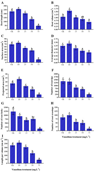 The influence of various V treatments on root morphological traits; (A) root length, (B) root volume, (C) surface area, (D) average diameter, (E) projected area, (F) number of root tips per plant, (G) number of root forks per plant, (H) number of root crossings per plant, and (I) root length per volume. Duncan’s test specifies a significant difference (p < 0.05) between the means of the five treatments indicated by different letters.