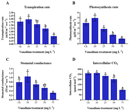 The influence of various V treatments on leaf gas exchange elements; (A) transpiration rate, (B) photosynthetic rate, (C) stomatal conductance, and (D) intercellular CO2. Duncan’s test indicates a significant difference (p < 0.05) between the means of the five treatments indicated by different alphabets.