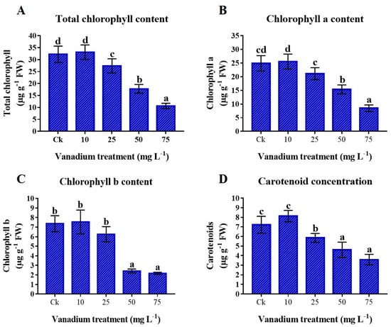 The chlorophyll (Chl) was significantly influenced by the application of V stress. Compared to the control, adding 10 mg L−1 V did not significantly raise the concentration of chlorophyll and carotenoid (Car) (Figure 4). On the other hand, higher treatment of V (25, 50, and 75 mg L−1) showed a significant negative impact on the photosynthetic pigments, and utmost reduction was detected at 75 mg L−1. Compared to the control, 77% reduction in the content of total chl, 65.9% in chl a, 70.5% in chl b, and 50.3% in Car were detected (Figure 4).