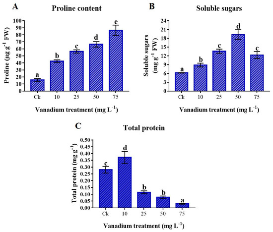 The proline content was significantly increased as the level of V increased (p < 0.05). The maximum rise of 448.3% in proline content was detected at 75 mg L−1 V treatment (Figure 6A). Soluble sugars were also significantly higher in V-treated plants (p < 0.05). The content of soluble sugars in the leaves of sweet potato was increased to 50 mg L−1; however, at 75 mg L−1 V, the content of soluble sugars decreased but was still significantly higher (97.6%) than the control plants (Figure 6B). Furthermore, the results exhibited that the total proteins were significantly increased at 10 mg L−1 V treatment; later, a significant decrease was observed at a higher level of V treatment (p < 0.05). The lowest protein content (0.029 mg g−1) was observed at 75 mg L−1 V treatment compared to the control (Figure 6C).