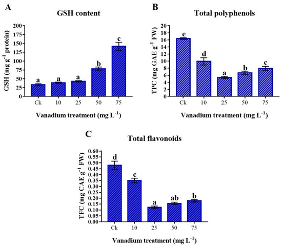 The GSH content in the leaf of sweet potato increased with the rise of V treatment, and the maximum concentration was observed at 75 mg L−1 V treatment (Figure 7A). The GSH content at 10 and 25 mg L−1 V treatment was insignificantly increased (16.4 and 28.5%); however, a significant increase was observed at 50 and 75 mg L−1 V treatment, which were 134% and 324% higher than the control, respectively. Total polyphenols and flavonoid concentrations decreased significantly with the rise of V treatment (p < 0.05). Interestingly, total polyphenols and flavonoids drastically reduced at 10 and 25 mg L−1 V treatment, then again increased at 50 and 75 mg L−1 V treatment, however still significantly lower than in the control plants (Figure 7B,C).