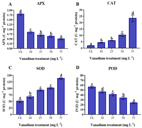 Antioxidant enzyme activities were significantly influenced by V treatment (p < 0.05). We found a significant decrease in APX and POD activities with the rise of V concentration (p < 0.05; Figure 8A,D), and maximum reduction was detected at 75 mg L−1 of V treatment. As compared to the control, a 62.1% reduction in APX and a 57.5% in POD was detected at 75 mg L−1 V treatment. Conversely, the CAT and SOD were positively influenced by V treatment, and a significant increase was observed with the rise in V concentration (p < 0.05; Figure 8B,C). Furthermore, the highest activities of CAT and SOD were observed at the 75 mg L−1 V treatment, and a 1085% increase in CAT and a 164.7% increase in SOD were observed compared with the control.