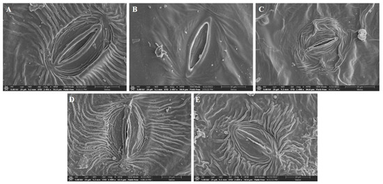 To observe the stomatal morphology, we used a published protocol [30]. To remove any debris, leaves were acetylated in 80% ethanol for two to three min. The tiny sections of leaf were prepared using s-cutting, and after that platinum was used to fix the abaxial and adaxial surfaces and sputtered using Leica Mikrosystem GmbH (ACE600) for 25 min, and finally examined under a SEM (Thermo Scientific, Verios G4 UC, Waltham, MA, USA).