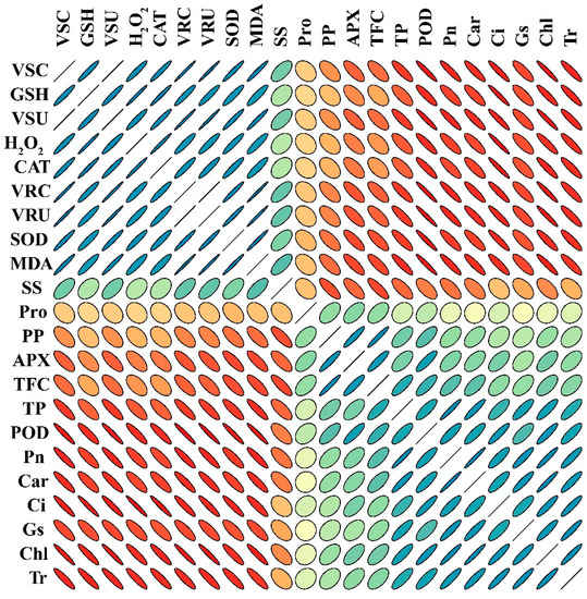 Pearson’s correlation analysis (PCA) (p < 0.05) was calculated among different traits of V-treated sweet potato seedling. VSC (V shoot concentration), GSH (reduced glutathione), VSU (V shoot uptake), H2O2 (hydrogen peroxide), CAT (catalase), VRC (V root concentration), VRU (V root uptake in root), SOD (superoxide dismutase), MDA (malondialdehyde), SS (soluble sugars), Pro (proline), PP (total polyphenols), APX (ascorbate peroxidase), TF (total flavonoids), TP (total proteins), POD (peroxidase), Pn (photosynthetic assimilation), Car (carotenoids), Ci (Intercellular CO2), Gs (stomatal conductance), Chl (total chlorophyll), and Tr (transpiration rate). Measured determinants and strength correlation matrix. The color code for Pearson correlation coefficients (r), with r = 2, r = 0, and r = −2 denoting red, orange, green, and gray, respectively. A stronger association is denoted by better anisotropy, and the slope of the corresponding line or ellipse represents the trend of that association (positive or negative). Additionally, the ellipses’ direction and anisotropy indicate the slope and strength of the relationship. According to the first principal component order, variables were arranged.