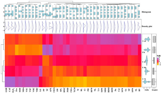 A heatmap-histogram analysis of different growth traits of sweet potato under different levels of V treatment was also constructed (Figure 11). A significant difference was observed with different colors in the different V treatments and responses of different physiological and biochemical parameters, as well as V concentration and uptake. However, traits with red color indicate insignificant differences within the V treatments. This heatmap-histogram showed a noticeable difference among the growth traits and uptake of V in the sweet potato plant.