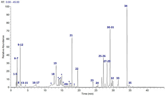 Extracted ion chromatogram of the main metabolites identified in JasHEx. Those indicated by * were included in Molecular Networks (MNs).