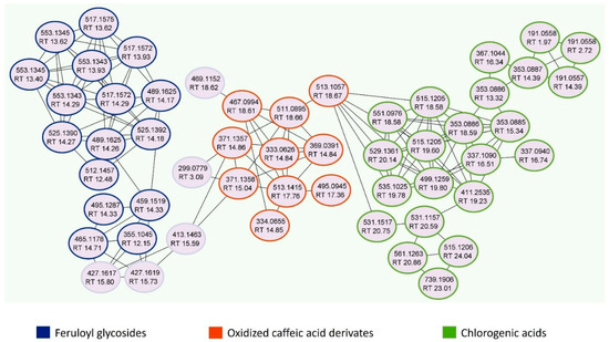 Furthermore, a Feature-Based Molecular Networking (FBMN) job was also carried out. It is able to group related NPs within a network since structurally similar molecules share similar MS/MS fragmentation patterns [20]. The FBMN job allowed us to identify several chlorogenic acids, reported in Figure 2 and Table S1 and circled in green. Compounds eluted at 13.32, 14.39 and 15.34 min and generating the same deprotonated ion [M-H]− at m/z 353.09 were recognized as mono caffeoylquinic acids (CQA, C16H18O9, mass error of 5.38 ppm). Indeed, MS2 ions at m/z 191.06 and 173.04 correspond to deprotonated and dehydrated quinic acid, while fragments at m/z 179.03 and 135.04 derive from the deprotonation and decarboxylation of the caffeoyl moiety. The MS2 base peak of the species with RT 15.34 min at m/z 173.04 allowed its assignation as 4-CQA. The other two compounds provided the same MS2 base peak ion at m/z 191.06, but the intensity of the fragment ion at m/z 179.03 allowed to identify the first compound (RT 13.32; m/z 179.03 intensity of 40%) as 3-CQA and the second (RT 14.39; m/z 179.03 intensity of 4%) as 5-CQA [23].