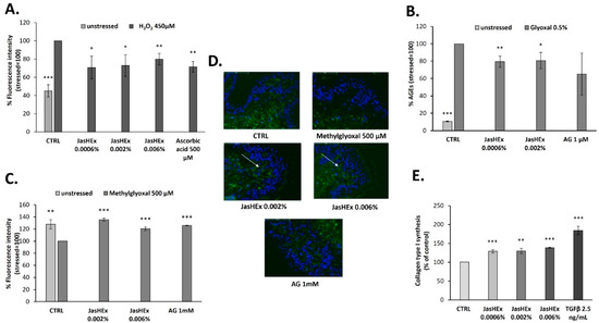 Since AGE formation is dependent on oxidation reactions, JasHEx anti-glycation activity by an enzyme-linked immunosorbent assay (ELISA) was evaluated. It allowed us to detect, by a specific antibody, AGE products in human dermal fibroblasts (HDF), treated or not with the extract (0.0006% and 0.002% p/v), in the presence of 0.5% glyoxal at 50 °C for one week. Aminoguanidine (AG) 1 µM was used as the positive control. The treatment with 0.5% glyoxal stimulated the formation of AGE products by 90%, whereas the incubation with JasHEx at both concentrations was able to reduce it by 20% (Figure 3B).