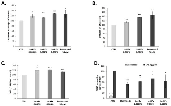 Bar graphs showing JasHEx effect (A) to activate Nrf2/ARE signaling, (B) to increase OH-1 and (C) SOD-1 gene expression in HaCaT cells and (D) to reduce NO production in LPS-stimulated RAW 264.7 cells. The bars represent the standard deviations and the asterisks indicate significant variations according to Student’s t-test (* p < 0.05, ** p < 0.01, *** p < 0.001).