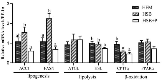 The mRNA expression of the lipogenesis gene FASN was significantly downregulated in the HSB+P and HFM groups compared to the HSB group (Figure 1, p < 0.05). The mRNA level of ACC1 was also significantly downregulated in the HSB+P group compared with the HSB group, while HFM presented intermediate levels and was not significantly different from the other groups. The mRNA level of the lipolysis gene HSL was significantly downregulated in HSB+P compared to the HSB and HFM groups (p < 0.05). On the other hand, the β-oxidation gene CPT1α was significantly upregulated in the HFM group compared to the other two groups (p < 0.05).