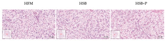 Hepatic antioxidant capacity parameters are shown in Table 7. Liver ROS, T-AOC, and CAT were significantly increased in the HSB group compared with the other two treatments (p < 0.05). Significant differences were observed between the three groups in GSH-Px, with the HSB+P group having the highest activity, followed by the HFM group, and HSB group showed the lowest activity (p < 0.05). There were no significant differences in hepatic SOD and MDA among the three groups (p > 0.05).