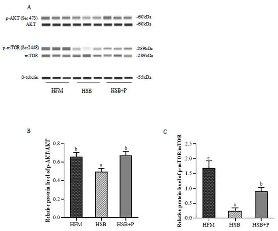 Liver tissue was extracted in RIPA Reagent (Beyotime, Shanghai, China) with phosphatase and protease inhibitor cocktail (Cell Signaling Technology, Boston, MA, USA). The density of protein was measured by a BCA Protein Quantification Kit (Bio-Rad, CA, USA). Automated western blots were performed by a JessTM capillary western blot system (ProteinSimple, Santa Clara, CA, USA) using pre-filled plates (12–230 kDa and 44–660 kDa) according to the manufacturer’s instructions. The primary antibodies were β-tubulin (Cell Signaling Technology, #2146, 1:50 dilution), AKT (Cell Signaling Technology, #9272, 1:50 dilution), P-AKT (Ser 473) (Cell Signaling Technology, #4060, 1:300 dilution), mTOR (Cell Signaling Technology, #2972, 1:100 dilution), and P-mTOR (Ser 2448) (Cell Signaling Technology, #2971, 1:50 dilution).