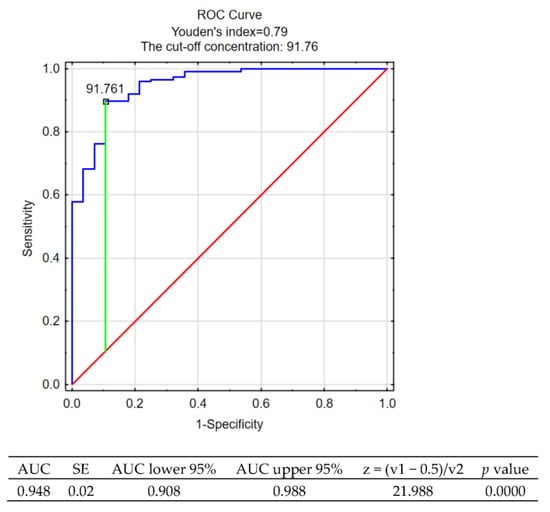 ROC analysis performed on the group of patients suffering from RRMS and on the control group indicated that a specified concentration of AOPP could be a powerful parameter to discriminate the patients with RRMS from healthy subjects. The cut-off concentration of AOPP was estimated as 91.761 [µM] (Figure 1).