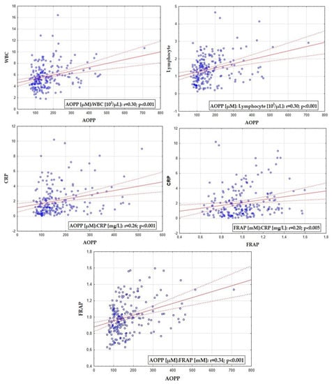Statistically significant correlations between either FRAP or AOPP and WBC, lymphocytes, and CRP (for the whole study group). FRAP—ferric-reducing antioxidant power; AOPP—advanced oxidation protein products; CRP—C-reactive protein; WBC—white blood cells.