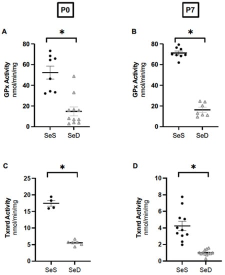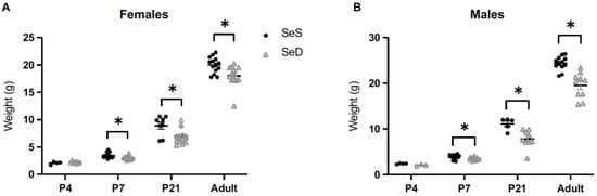 Selenium deficiency is associated with several markers of poor health in infancy, including postnatal growth failure [43]. We have previously reported that pups born to Se deficient dams have similar weights at birth in comparison to pups born to Se sufficient dams [36]. To evaluate the effect of continued Se deficiency during lactation on neonatal somatic growth, we assessed weights of Se sufficient (SeS) and Se deficient (SeD) pups at postnatal days 4, 7, and 21, and 8–10 weeks of life. We found that SeD female and male pups weighed less than SeS female and male pups at postnatal days 7 and 21, and 8–10 weeks (Figure 1A,B).