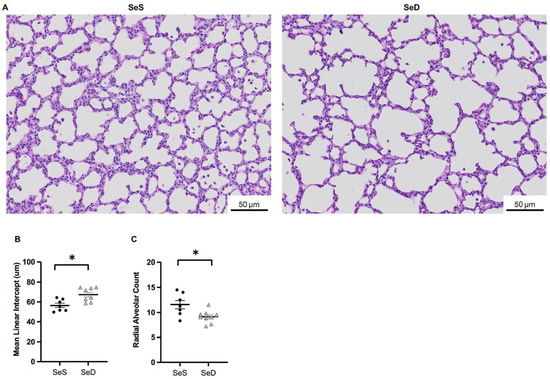 Neonatal Se deficient rats demonstrate impairments in alveolar growth [17]. We sought to determine if alveolar growth was similarly impaired in neonatal Se deficient mice at postnatal day 7, an early time point in the alveolar stage of lung development. We selected this time point as it is the stage of murine development consistent with a human neonate born at term. We measured mean linear intercept (MLI), an objective measurement of alveolar development that reflects the average distance between alveoli [44,45]. MLI was increased in Se deficient pups compared to Se sufficient pups (Figure 2A,B). We next measured RAC, another objective measurement of alveolar development that assesses the number of alveoli [46,47]. RAC were lower in Se deficient pups when compared to Se sufficient pups (Figure 2A,C). Sex has been reported as a significant biological variable in neonatal hyperoxia studies, where male mice are more susceptible to injury than females [48]. Thus, we evaluated our results by sex and found no differences in either MLI or RAC between SeS or SeD male and female pups (Supplemental Figure S1).