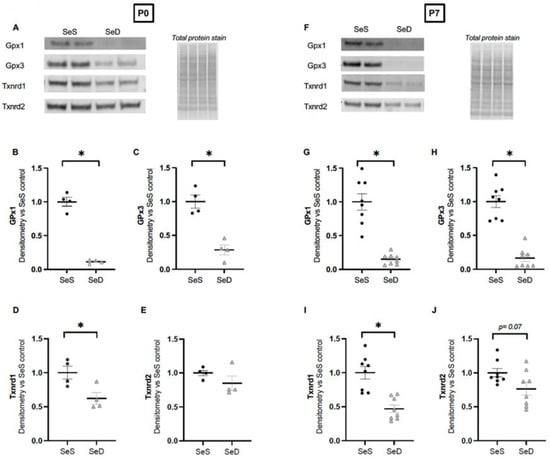 A complex hierarchy Se-dependent protein tissue-specific expression is well described in adult rodents, wherein quantities of specific selenoproteins decrease rapidly in the setting of limited Se supply while others are preferentially preserved [49]. This is reported to differ by age, organ and cell type, and has not been evaluated in the neonatal lung [33]. Elucidation of the neonatal lung selenoprotein hierarchy in the setting of Se deficiency may provide insights into susceptibility to different exposures. Thus, we measured the protein content of several key GPx and Txnrd isoforms in neonatal lungs. GPx1 and GPx3 have both been reported to as important to the pulmonary response to oxidative stressors in adult rodent, thus we first measured the content of GPx1 and GPx3 in the neonatal lung [20,21,50]. We found that both GPx1 and Gpx3 were significantly lower in SeD lungs at both P0 and P7 when compared to SeS lungs (Figure 4A–C,F–H). Embryonic deletion of Txnrd1 or Txnrd2 lethal, suggesting an essential role in embryogenesis and organ development [51,52]. Our data revealed that Txnrd1 content was significantly decreased in P0 and P7 SeD lungs (Figure 4A,D,F,I). In contrast, Txnrd2 content was not significantly different between SeS and SeD lungs at either time point (Figure 4A,E,F,J).