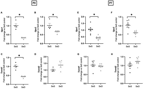 Decreased selenoprotein expression during limited Se conditions can occur due to decreased transcription and/or post-translational modifications [19]. To evaluate the impact of Se deficiency on pulmonary selenoenzymes, we measured the mRNA transcripts of Gpx1, Gpx3, Txnrd1 and Txnrd2 at P0 and P7. At P0, we found that SeD lungs exhibited decreased mRNA transcripts for GPx1, Gpx3 and Txnrd1 (Figure 5A–C), and similar Txnrd2 mRNA transcripts compared to SeS lungs (Figure 5D). At P7, we also observed decreased mRNA transcripts for GPx1 and GPx3 in SeD lungs (Figure 5E,F). Transcript levels or Txnrd1 and Txnrd2 were inbetween SeS and SeD pups (Figure 5G,H).