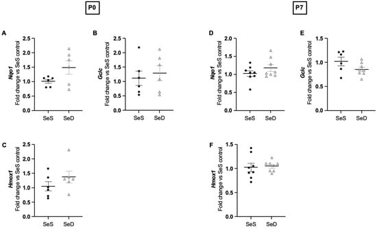 Se deficiency induces Nuclear factor erythroid 2-related factor 2 (NRF2) dependent gene transcription in adult rodents [53]. Pharmacologic inhibition of Txnrd similarly increases NRF2-regulated gene transcription in the lungs of neonatal mice [54]. To evaluate the impact of dietary Se deficiency on NRF-2 related gene transcription in the neonatal lung, we measured the mRNA transcripts for four NRF-2 regulated targets: nicotinamide adenine dinucleotide phosphate reduced quinone oxidoreductase-1 (Nqo1), glutamate-cysteine ligase (Gclc), and heme oxygenase 1 (Hmox1). At P0, we found no differences in the mRNA levels between SeS and SeD lungs (Figure 6A–C). Similarly, at P7, we found no differences in transcript levels between SeS and SeD lungs (Figure 6D–F).