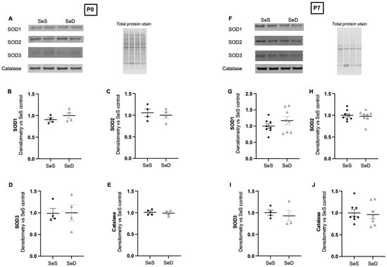 Se deficiency is demonstrated to increase several non-Se containing antioxidant enzymes (AOE) in the adult liver, including superoxide dismutase (SOD) [35,55,56]. We have reported that neonatal Se deficiency results in increased SOD2 protein content when Txnrd content is decreased. Thus, to evaluate if neonatal Se deficiency results in compensatory increases in several non-Se containing AOE known to increase after Se deficiency, we first measured the protein content for superoxide dismutase 1 (SOD1), mitochondrial superoxide dismutase 2 (SOD2), and extracellular superoxide dismutase 3 (SOD3). We observed no difference in the protein content of these at either postnatal day 0 or 7 (Figure 7A–D,F–I). As we found a significant decrease in GPx1, a mainly cytoplasmic enzyme that reduces hydrogen peroxide, we next measured the protein content of catalase, another cytoplasmic enzyme that also reduces hydrogen peroxide. We found unaltered catalase content between Se sufficient and deficient lungs at both P0 and P7 (Figure 7A,E,F,J).