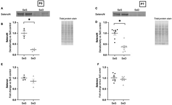 In addition to its importance in AOE function, Se is incorporated into several non-AOE that can impact organ development, including selenoprotein N [19]. Selenoprotein N is an endoplasmic reticulum bound selenoprotein important in myogenesis [57]. Intriguingly, total body selenoprotein N genetic knock-out mice develop impaired alveolar growth [58]. We have not found any reports testing if the protein expression of this selenoprotein is sensitive to Se supply in neonatal or adult mice. Thus, we sought to determine if limited Se supply during pregnancy and lactation decreased selenoprotein N in the lungs of neonatal mice. We found that SeD pups exhibited significantly decreased pulmonary selenoprotein N content at both P0 and P7 (Figure 8A–D). To evaluate if this decrease was transcriptionally regulated, we analyzed the mRNA transcripts for Selenon and found no difference in Selenon between Se sufficient and deficient pups at P0 or P7 (Figure 8E,F). Selenotranscriptomic analysis demonstrates that sex and organ specific differences in Selenon transcription after Se deficiency and excess can occur. Thus, we evaluated for sex differences in selenoprotein N protein expression and mRNA at P7 and did not find a difference between Se sufficient males and females, or Se deficient males and females (Supplemental Figure S3). These results indicate that pulmonary selenoprotein N is regulated by Se supply in infancy and decrease in the Se deficient lung during the saccular and early alveolar stages of lung development.