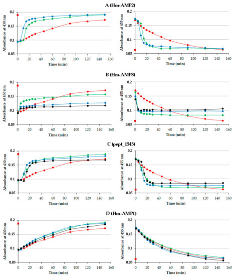 Time courses of spectral absorbance changes at 430 nm (indicative of MPO ground state) and 455 nm (indicative of Compound II) in the absence and presence of cationic antimicrobial peptides (CAMPs) in the system MPO/H2O2. The name of CAMP is given in parentheses after the panel designation (A–D). H2O2 (100 µM) was added to MPO (2 µM heme) or MPO preincubated with peptides at different peptide/heme molar ratios for 5 min in 10 mM Na-phosphate buffer, pH 7.4. Spectra were taken before and 0.25 min, 5 min, 10 min, and so on after adding H2O2. The initial absorbance values (before H2O2 addition) are shown as a red square marker. Red curve—MPO in the absence of peptides; green curve—peptide/heme ratio of 15 mol/mol; blue curve 3—peptide/heme ratio of 75 mol/mol, except for Hm-AMP2 for which it was 45 mol/mol; black curve—peptide/heme ratio of 100 mol/mol for Hm-AMP8 or 100 mol/mol and 125 mol/mol for pept_1545. Data are representative of three independent experiments.