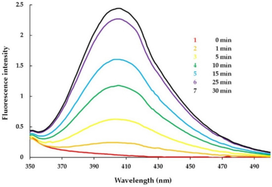 Since dityrosine is an intensely fluorescent compound, the fluorescence method can be applied to detect its formation. MPO (0.4 µM heme) and tyrosine-containing Hm-AMP2 (40 µM) or HM-AMP8 (40 µM) were mixed in a cuvette in 10 mM Na-phosphate buffer, pH 7.4. No emission peak characteristic of dityrosine was observed. Succeeding spectra were recorded at time intervals after H2O2 (50 µM) addition. Dityrosine formation was monitored by the increase in fluorescence intensity. The results obtained for Hm-AMP2 distinctly indicated the time-dependent generation of dityrosine (Figure 3).