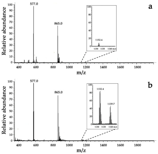 Mass spectra are shown in Figure 4. A mass spectrum of control Hm-AMP2 sample gave a prominent peak at m/z = 577.0 which corresponded to the peptide’s triply charged ion with a mass of m = [M + 3H]3+ (z = 3, spectral m/z value = 577.0). Another intense peak at m/z of 865.0 was assigned to the doubly charged peptide ion. Trace amounts of a compound at m/z = 1152.4 (expanded in the inset in Figure 4a), which may be ascribed to the peptide’s double mass minus two, were also observed. This product probably originated from spontaneous cross-linking reactions. For the Hm-AMP2/MPO/H2O2 sample in which the presence of dityrosine was fluorometrically confirmed, the intensity of the [2M − 2H + 3H]3+ ion signal at m/z = 1152.4 was found to be 20-fold increased as compared with that in the control spectrum. The signal of the dimerized peptide’s sodium adduct at m/z = 1159.7 was also observed. These results can be interpreted as an indication of the presence of dityrosine cross-linked Hm-AMP2 molecules. These data, together with fluorescence data, are consistent with the suggestion that tyrosine of Hm-AMP2 is capable of reacting with Compounds I and II with subsequent formation of dityrosine cross-linked peptide dimer.