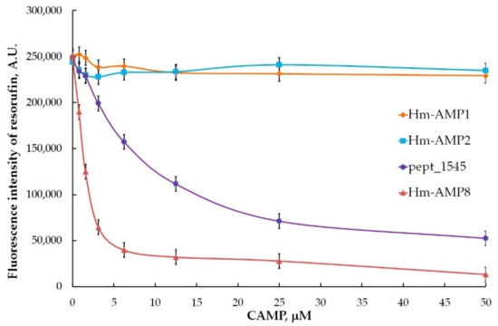 MPO peroxidase activity towards Amplex Red and H2O2 in the presence of the cationic antimicrobial peptides Hm-AMP1, Hm-AMP2, pept_1545, and Hm-AMP8 at 0.8–50 μM (peptide/heme molar ratio from 100 to 6250). The concentrations were as follows: 8 nM MPO heme, 50 μM Amplex Red, and 25 μM H2O2 in 50 mM K-phosphate buffer, pH 7.4.